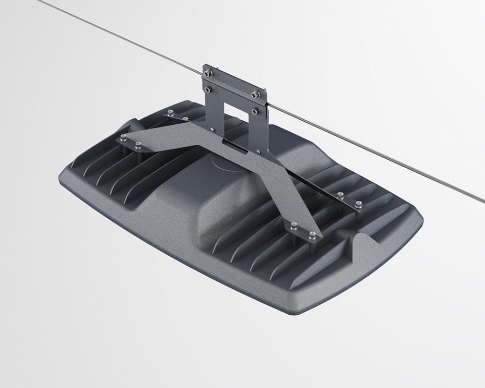 В зависимости от решаемых задач светильник комплектуется регулируемым накладным креплением, либо креплением для монтажа на несущем тросе, либо для монтажа на тросовых подвесах.